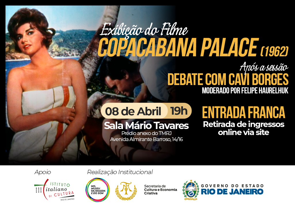 A Fundação Museu da Imagem e do Som do Rio de Janeiro realiza, no próximo dia 8 de abril de 2026, às 19h, a exibição especial do filme Copacabana Palace (1962), dirigido por Steno, em parceria com o Theatro Municipal do Rio de Janeiro e o Istituto Italiano di Cultura di Rio de Janeiro. A sessão acontece na Sala Mário Tavares e contará, após a exibição, com um debate com o cineasta Cavi Borges, com mediação de Felipe Haurelhuk, abordando temas como cinema, memória, preservação e a construção do imaginário do Rio de Janeiro.
