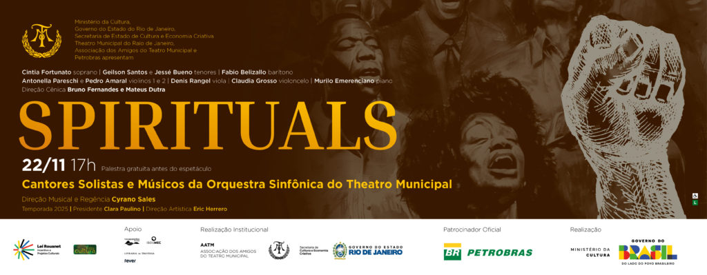 Spirituals, concertocom o Coro e Músicos do Theatro Municipal do Rio de Janeiro, terá única apresentação no dia 22 de novembro, sábado, às 17h, pela primeira vez no palco principal. O espetáculo foi apresentado em 2023 na escadaria interna do Theatro e no ano passado, no Salão Assyrio. Com o Patrocínio Oficial Petrobras, a proposta é levar os cantores e instrumentistas do Theatro Municipal, sob direção musical e regência de Cyrano Sales, para mostrar o gênero musical que surgiu nos Estados Unidos e foi interpretado, inicialmente, por escravizados negros.